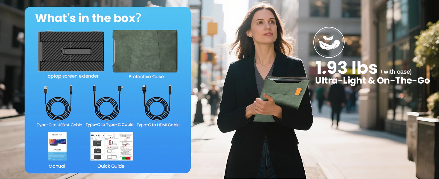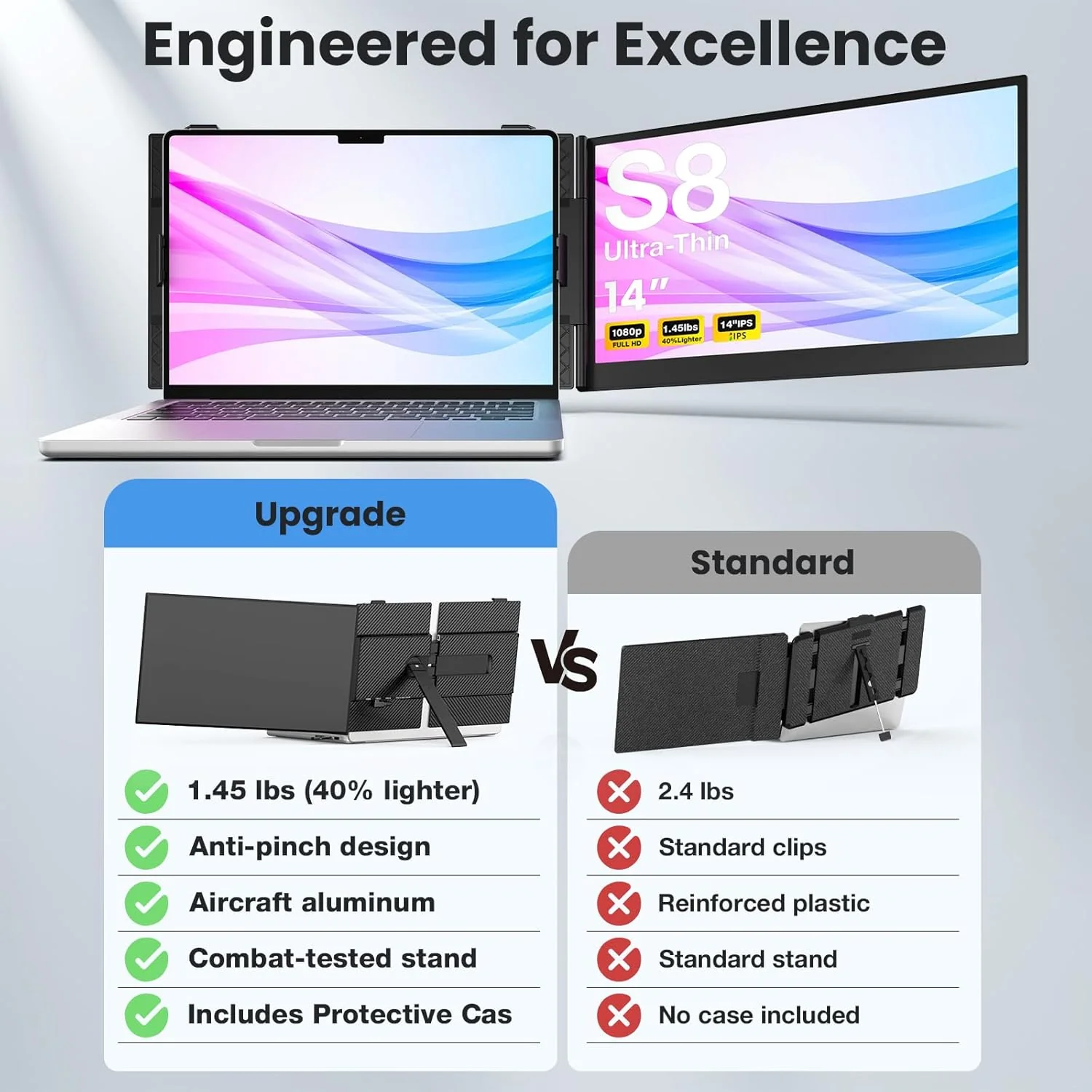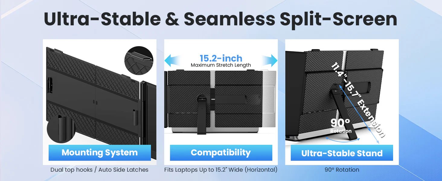 - Multiple Display Modes & Boosted Productivity: Supports extended, mirrored, and portrait modes, eliminating the limits of a single screen and reducing constant tab switching. Seamlessly multitask across dual screens and boost productivity by up to 200%. The top hook secures the monitor to your laptop, while the adjustable rear stand allows flexible viewing angles and added privacy.