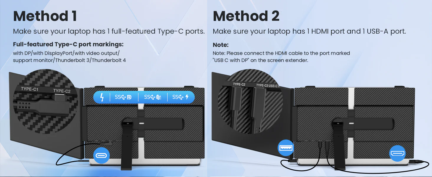 - Plug & Play, Easy Setup: Comes with all necessary cables for fast setup. If your laptop has a full-function Type-C port (Thunderbolt 3.0/4.0, supporting DP/video output), connect with a single USB-C cable. If not, use USB-A + HDMI for a smooth connection. Any display issues can be quickly resolved through our support team.