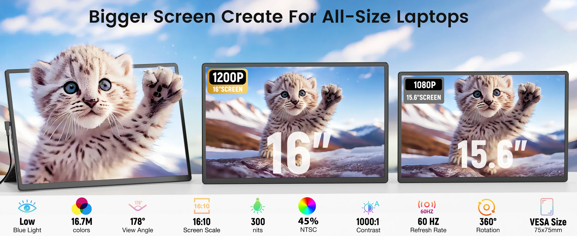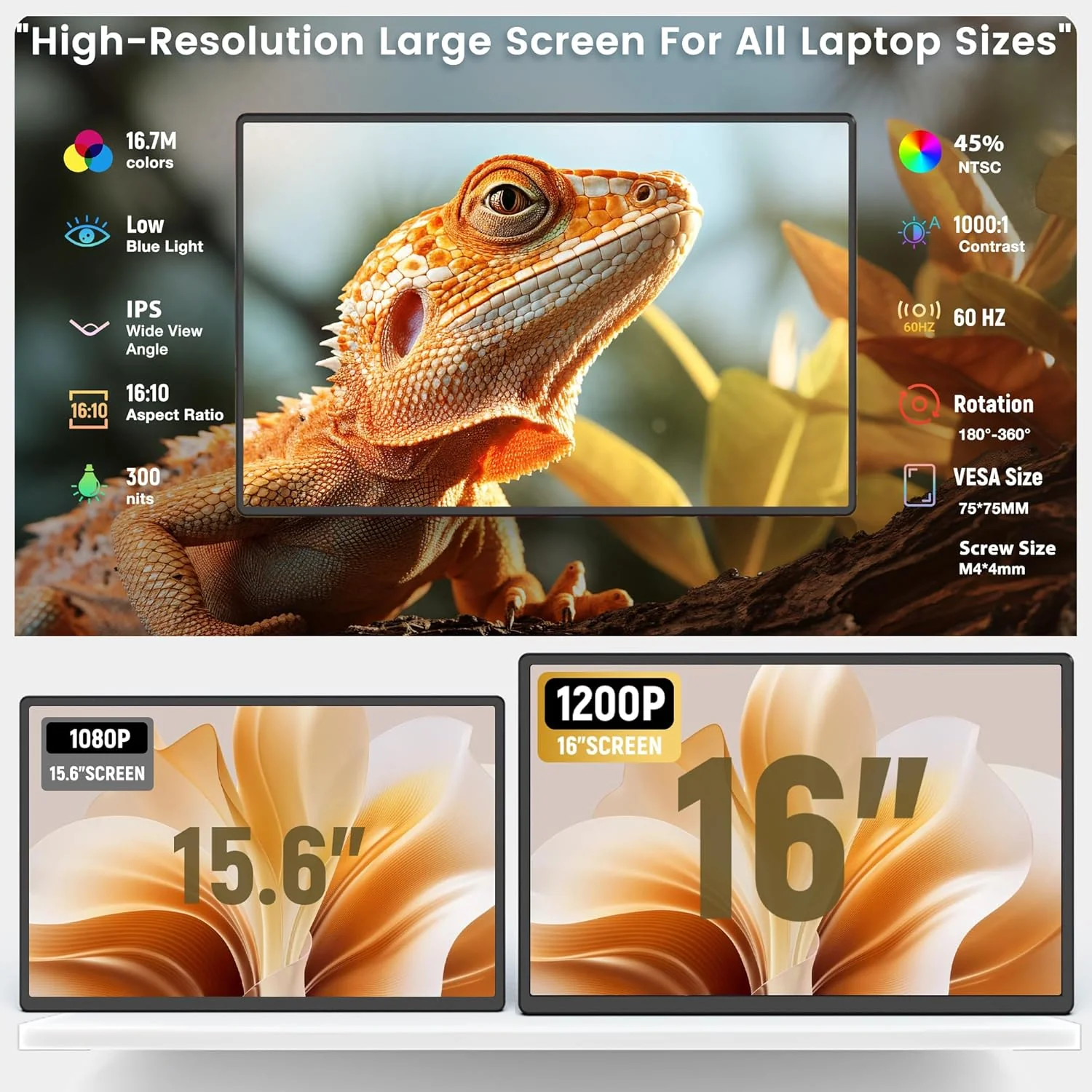 16" FHD SingleMonitor 1200P Plug & Play Enhanced Productivity Dual Screen Portable Monitor for Windows/Mac/Android